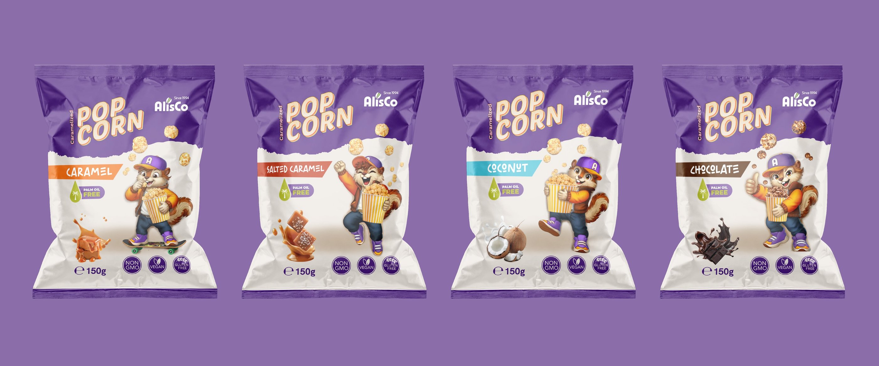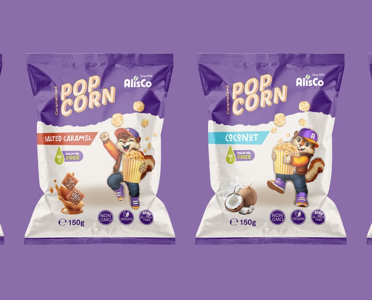 Spalvų paletėje derinama sodri violetinė ir švelni smėlio spalvos, suteikiant pakuotei išskirtinę, tačiau draugišką išvaizdą. Dizainas išryškina keturis gardžius skonius – karamelės, sūdytos karamelės, kokoso ir šokolado – todėl asortimentą lengva atpažinti, kartu išlaikant darnų ir akį traukiantį prekės ženklo identitetą.